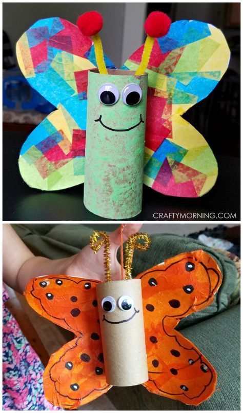 Schmetterlinge aus Klopapierrollen sind eine tolle Upcycling Bastelidee. Die Rollen werden bunt bemalt und mit Papierflügeln beklebt.