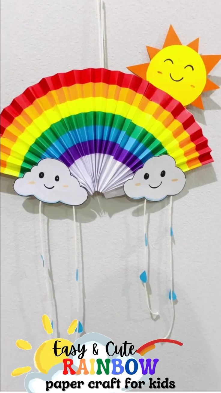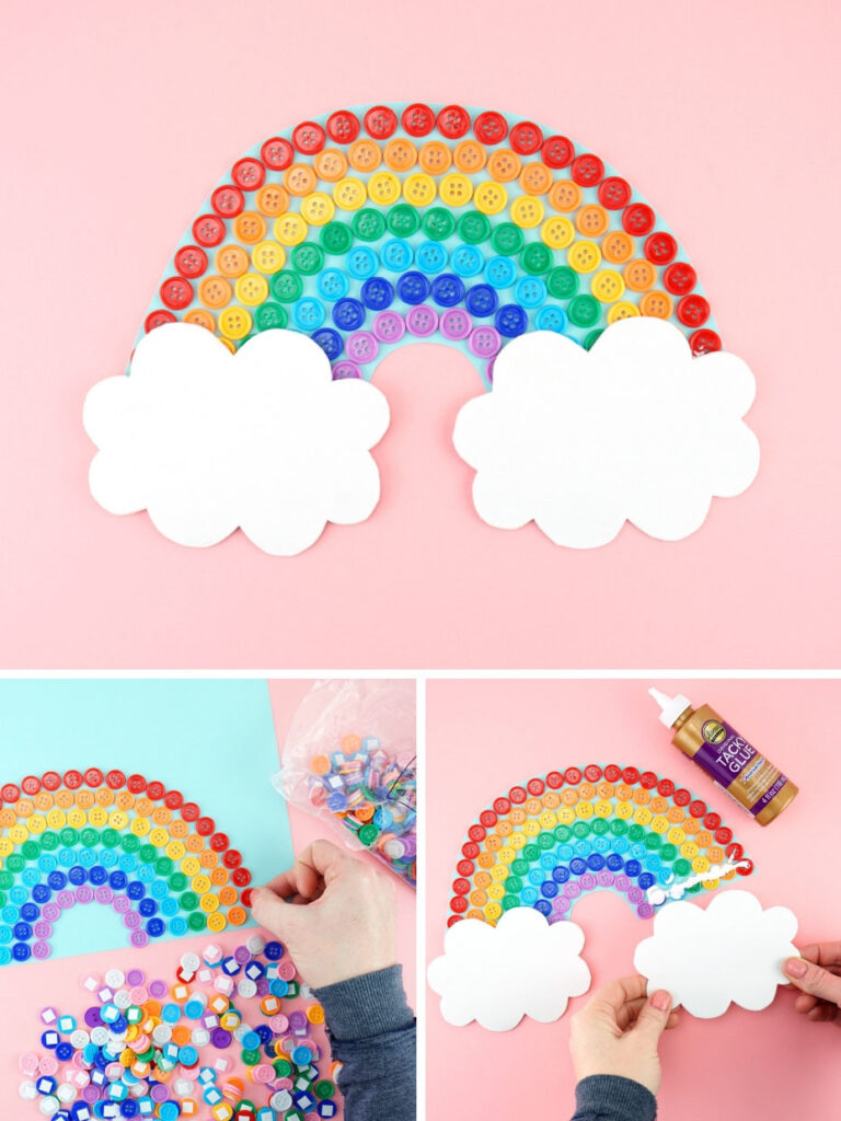Ein Regenbogen gehört zum Frühling einfach dazu. Kinder können Regenbögen aus Papier basteln und Watte als Wolken aufkleben.