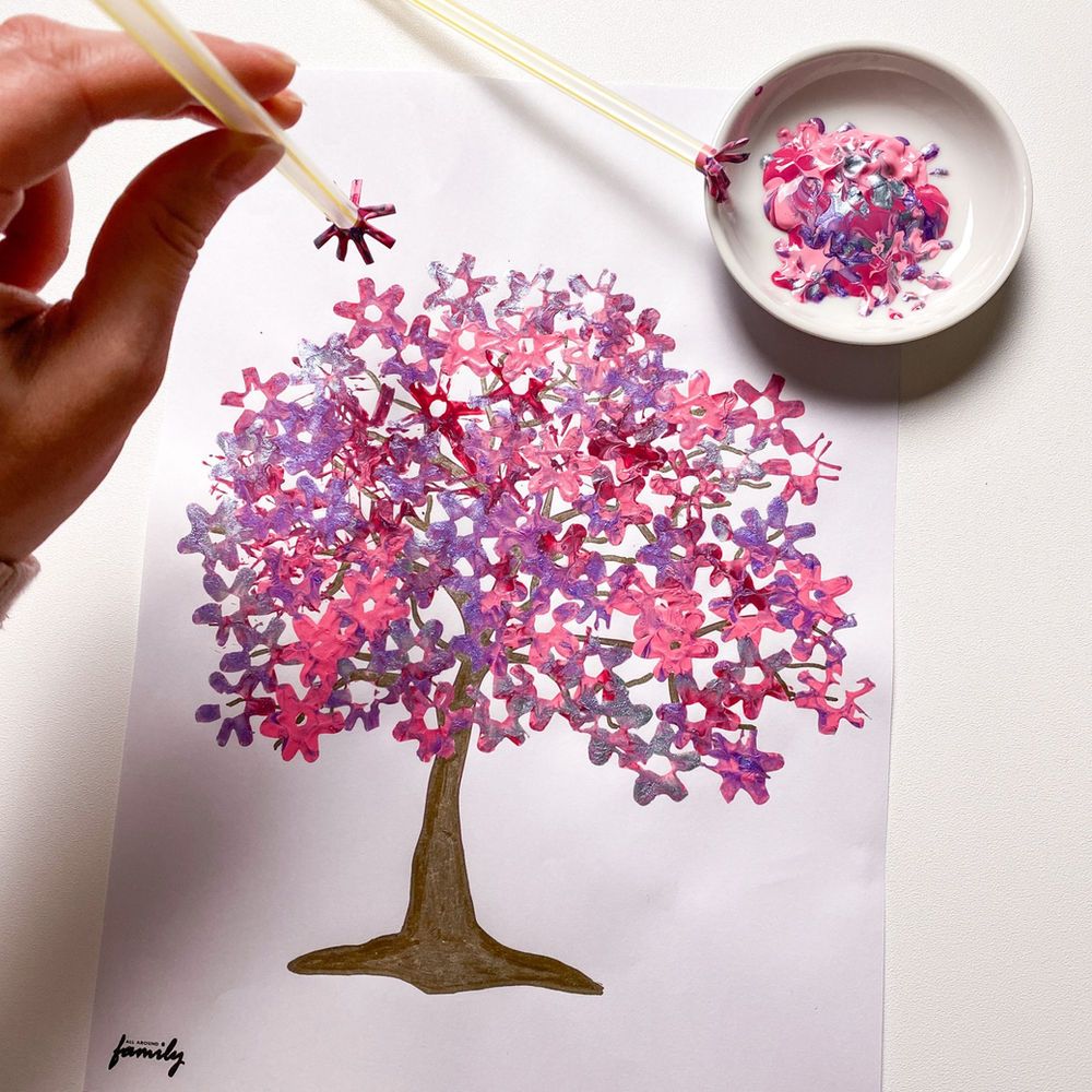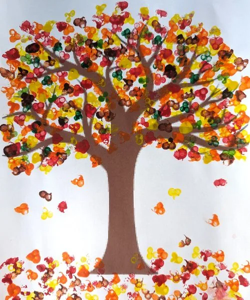 Ein Frühlingsbaum kann mit Fingerabdrücken gestaltet werden. Kinder tupfen mit Farbe Blätter auf einen Baumstamm.