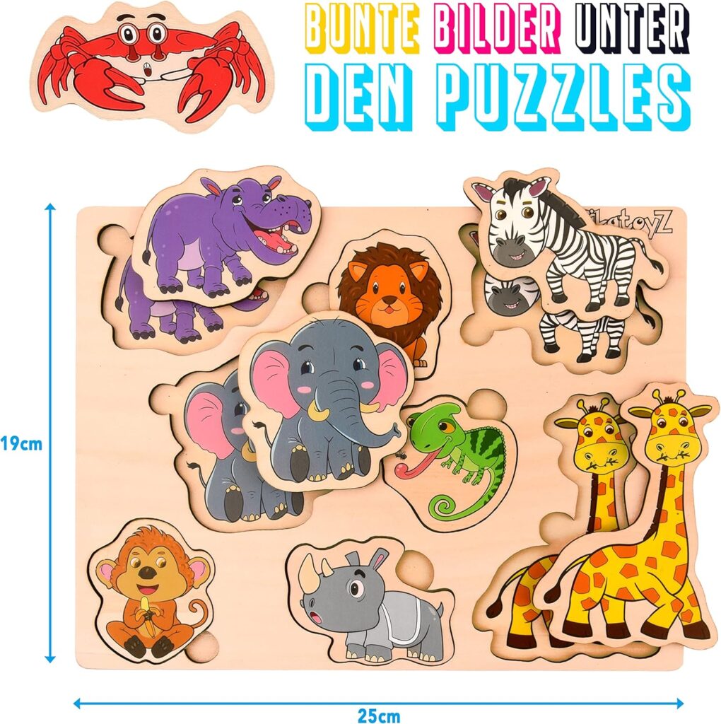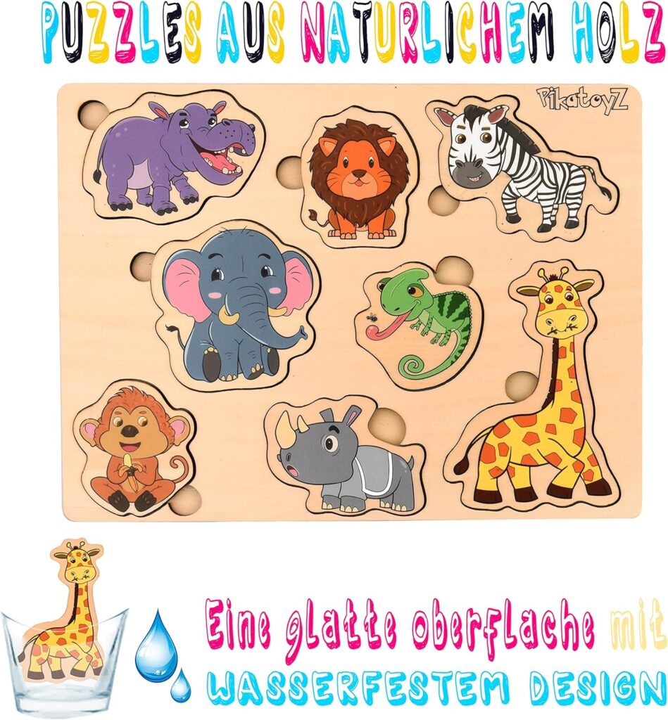 Große Holzformen erleichtern das Greifen und Einsetzen der Puzzleteile.